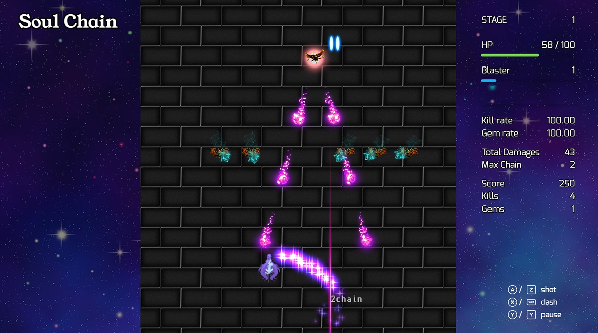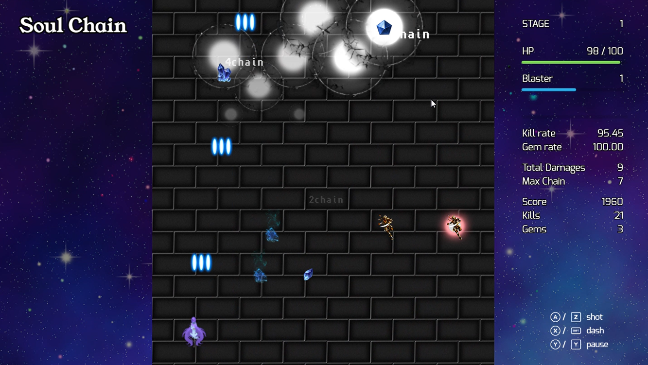 1面2分くらいで遊べる、連鎖システムが特徴のオーソドックスなSTGです。